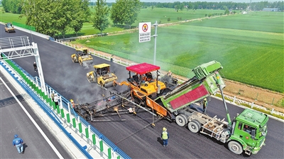 4月23日,沿黄高速公路兰考至封丘段项目施工现场,工人正在进行最后一段沥青面层的摊铺作业。当日,该项目全线沥青面层施工顺利收官,标志着这一河南省高速公路“13445工程”重点项目跨黄河通道主体工程全面完工,项目正式转入交工验收准备阶段。 本报全媒体记者 聂冬晗 摄