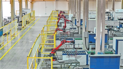 4月20日,在位于洛阳市伊滨区庞村镇的洛阳花都家具集团有限公司智能生产区,AGV运输小车、机械臂与数控冲床等协同作业,一派繁忙有序的生产景象。倪睿 摄